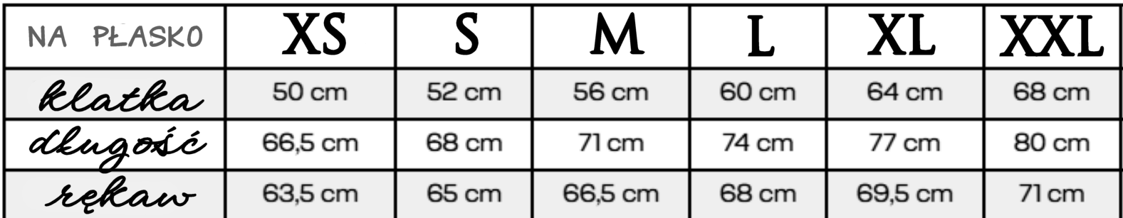 Tabela rozmiarów poniżej, krój luźny.